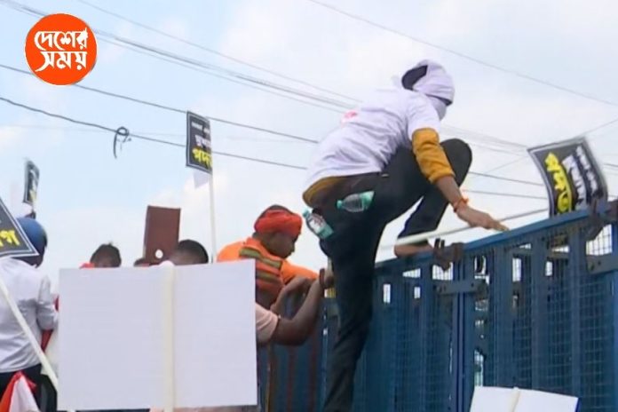 নবান্ন অভিযানকে কেন্দ্র করে বন্ধ হাওড়া ব্রিজে যান চলাচল। সকালের পর থেকেই হাওড়া ব্রিজে যান চলাচল নিয়ন্ত্রণ শুরু করে পুলিশ। বন্ধ করে দেওয়া হয় বাস চলাচল। হাওড়া ব্রিজ স্তব্ধ হয়ে যাওয়ায় চরম বিপাকে সাধারণ মানুষ। এই গরমে হেঁটে তেতেপুড়ে পার হতে হচ্ছে সেতু। বয়স্ক, বাচ্চা থেকে রোগী— ভোগান্তি চরমে। যাঁরা মেট্রো ধরেছেন, তাঁদেরও খুব সুবিধা হয়নি। হাওড়া মেট্রো স্টেশনে টিকিট কাউন্টারে দীর্ঘ লাইন। কাতারে কাতারে মানুষ দাঁড়িয়ে।