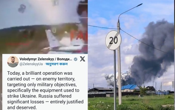 রাশিয়ার বিরুদ্ধে সফল অপারেশনের পরেই উচ্ছ্বসিত ইউক্রেন প্রেসিডেন্ট। এক্স হ্যান্ডলে তিনি লেখেন, ‘একটা চাপ দেওয়ার সত্যিই প্রয়োজন ছিল। রাশিয়ার উপর চাপ দেওয়ার দরকার ছিল, যাতে তারা বাস্তবে ফিরে আসে। নিষেধাজ্ঞার মাধ্যমে চাপ। আমাদের বাহিনীর চাপ। কূটনীতির মাধ্যমে চাপ। সবকিছু একসঙ্গে কাজ করতে হবে।’ ইউক্রেনের প্রেসিডেন্টের কথায়, শত্রু দেশের (রাশিয়া) ভূখণ্ডে একটি দুর্দান্ত অভিযান করা হয়েছে। শুধুমাত্র সামরিক লক্ষ্যবস্তু লক্ষ্য করে, বিশেষ করে ইউক্রেনে আক্রমণের জন্য ব্যবহৃত সরঞ্জামগুলিকে লক্ষ্য করে এই অভিযান করা হয়েছে। রাশিয়ার উল্লেখযোগ্য ক্ষতি হয়েছে — এটা সম্পূর্ণরূপে ন্যায্য এবং প্রাপ্য।’